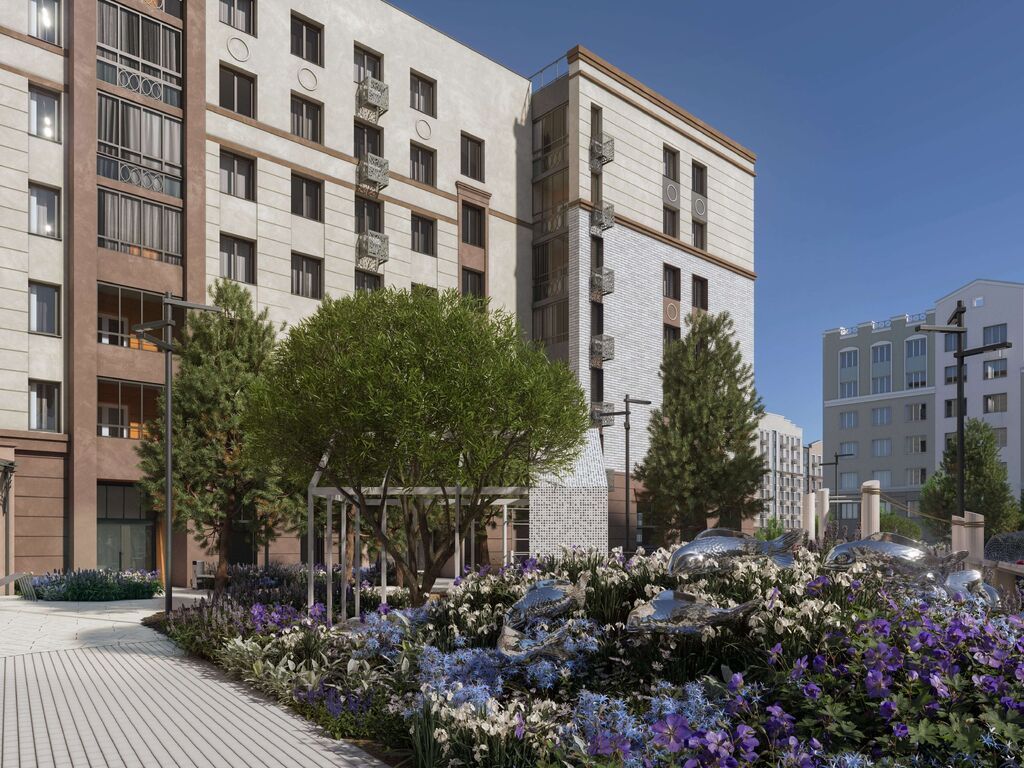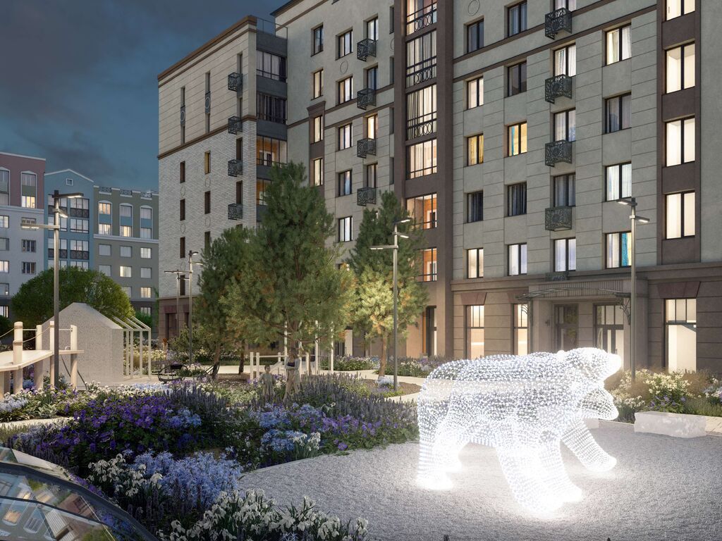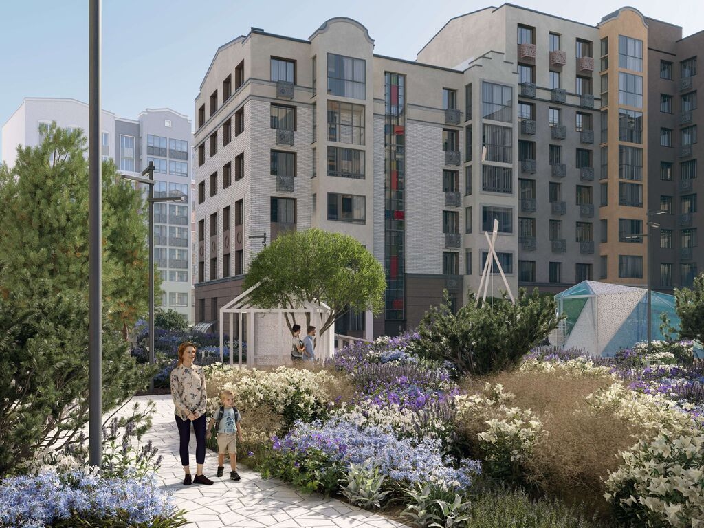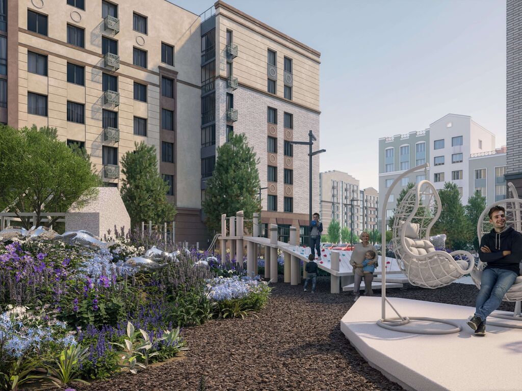 Каждый двор имеет уникальное наполнение: арт-объекты, релакс-зоны для взрослых и многофункциональные нейродинамические площадки для детей разных возрастов. Отдельно располагаются места для спокойного отдыха, паркинги и лужайки для выгула собак.