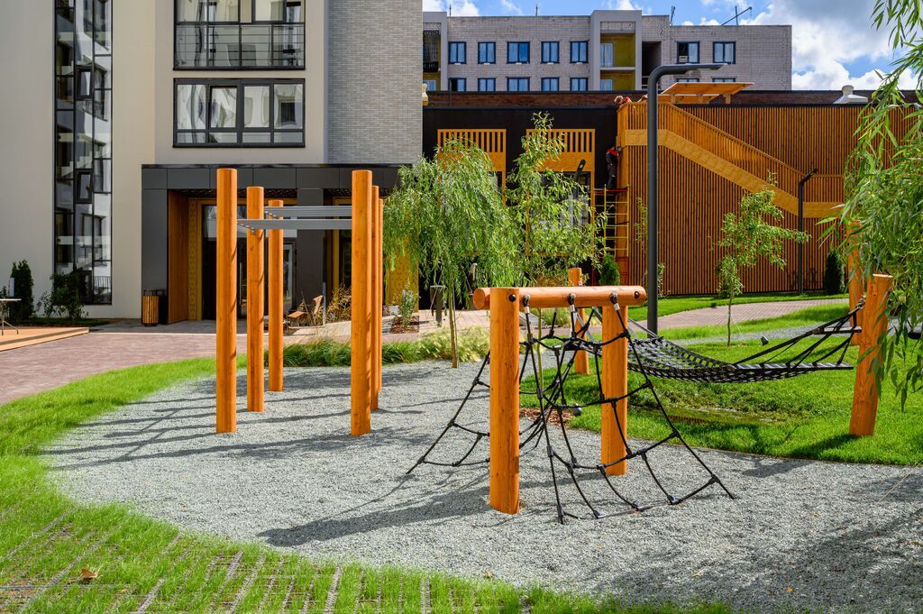 Жилой комплекс построен по принципу соразмерной среды: дома высотой от 4 до 8 этажей. Малоэтажная застройка позволила сделать виды из окон максимально открытыми на природу. Березовая роща, многолетние дубы, а также новые места притяжения будут видны из любой квартиры.