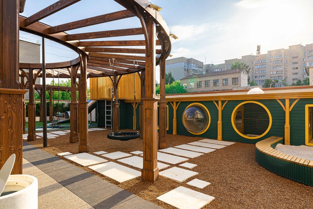 - Для самых маленьких жителей обустроены яркие площадки на свежем воздухе и предусмотрено игровое пространство внутри дома;