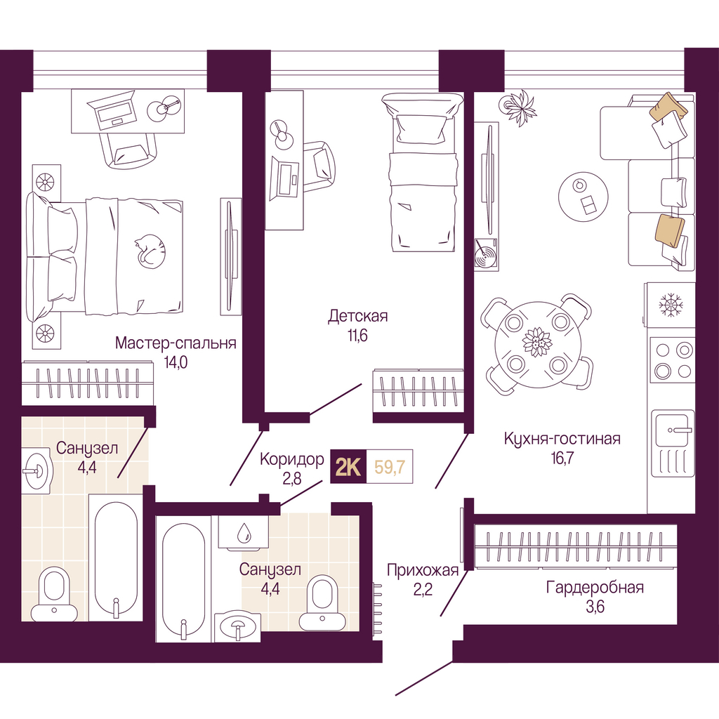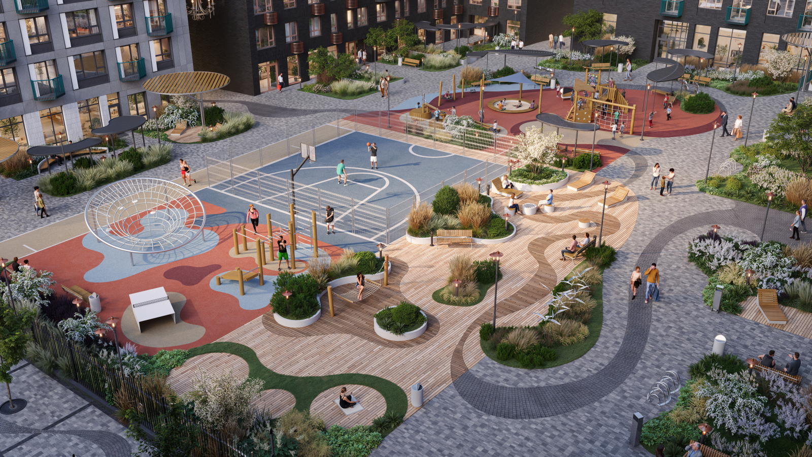 - Для самых маленьких жителей обустроены яркие площадки на свежем воздухе и предусмотрено игровое пространство внутри дома;