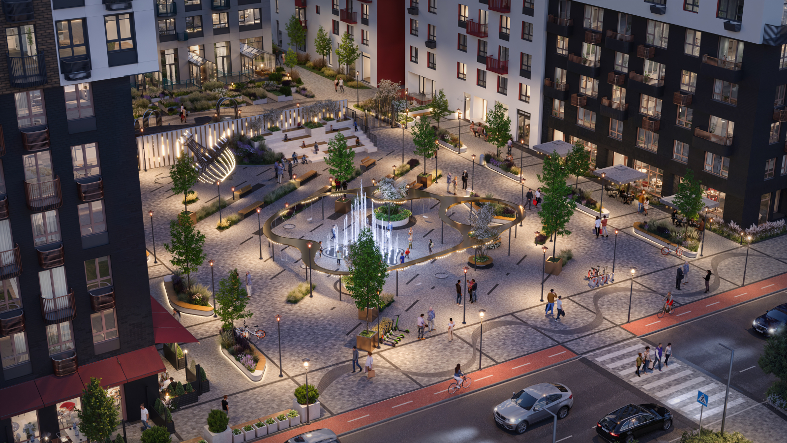 - Паркинг, концептуально вписанный в интерьер дома. Здесь предусмотрены гаражные боксы, семейные машиноместа и велопарковка, а также станции для электромобилей.