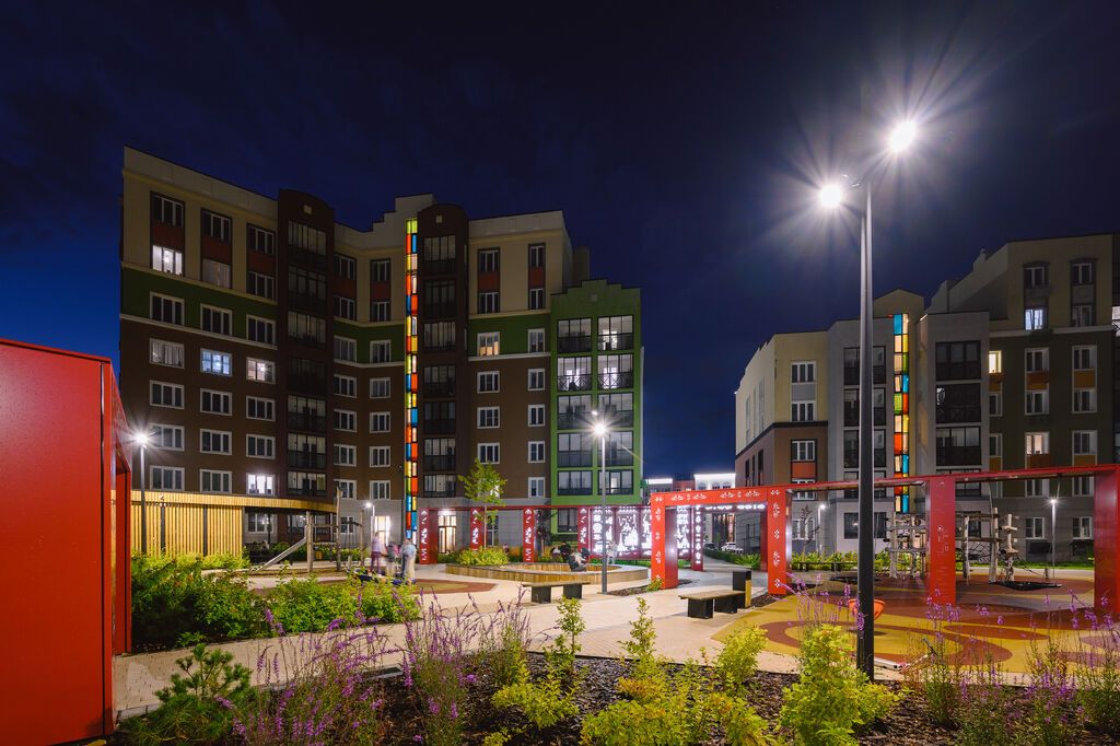 Каждый двор имеет уникальное наполнение: арт-объекты, релакс-зоны для взрослых и многофункциональные нейродинамические площадки для детей разных возрастов. Отдельно располагаются места для спокойного отдыха, паркинги и лужайки для выгула собак.